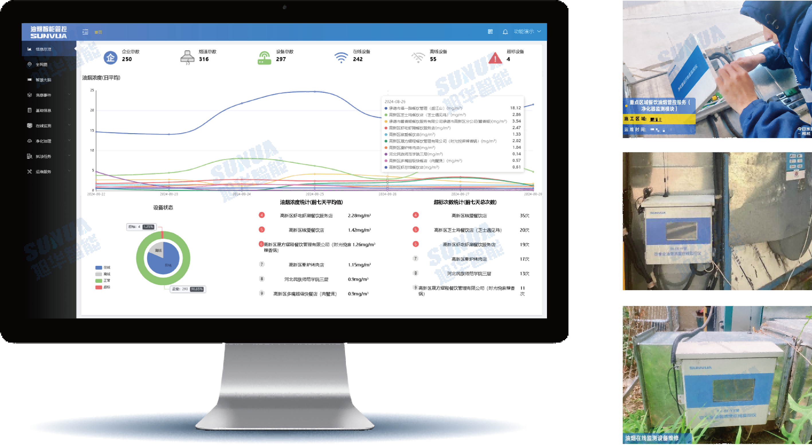 承建多地重点区域饮食业油烟浓度在线监测仪项目,建设餐饮油烟管控治一体化平台、监管app及餐饮服务单位app,安装上万台自主开发的饮食业油烟浓度在线监控仪及净化器运行状态监控仪。